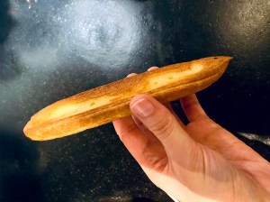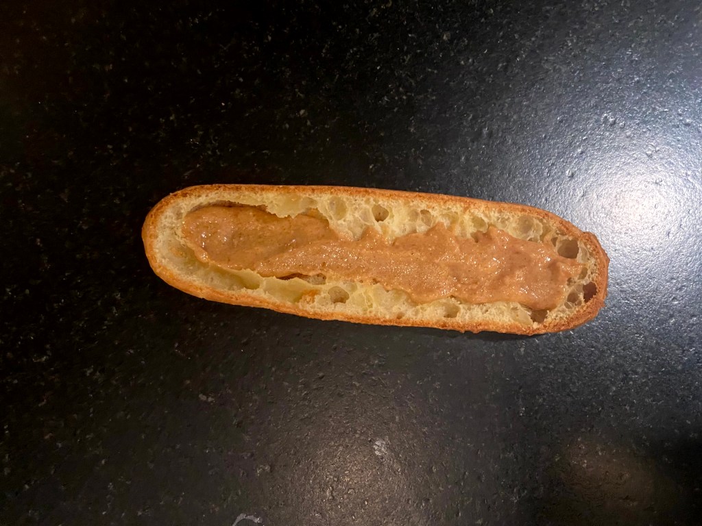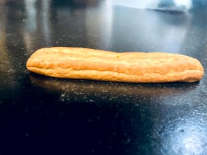 Je prends un éclair, et j’arrive à le couper en deux dans la longueur. Comme il est creux sur le dessous, je fais en sorte de découper le plus haut possible. Ça a l’air de marcher 🥳.