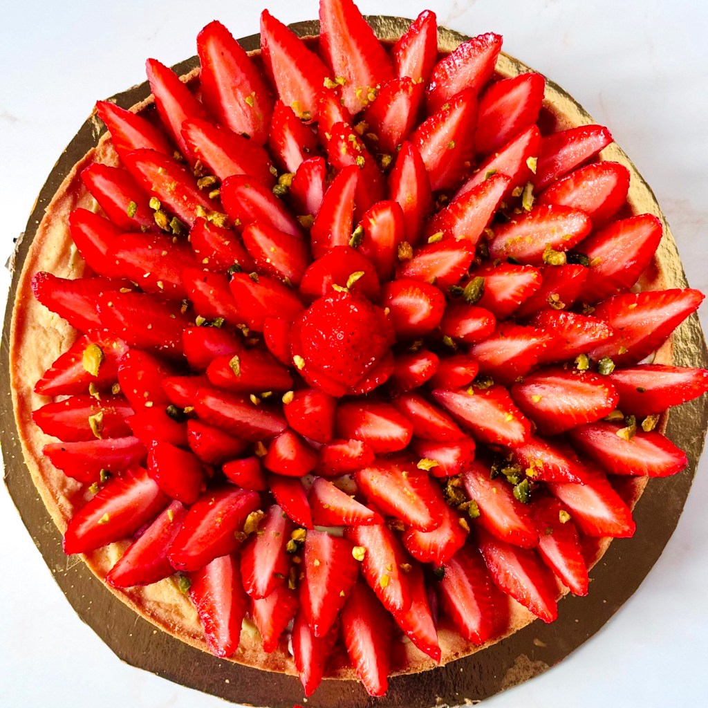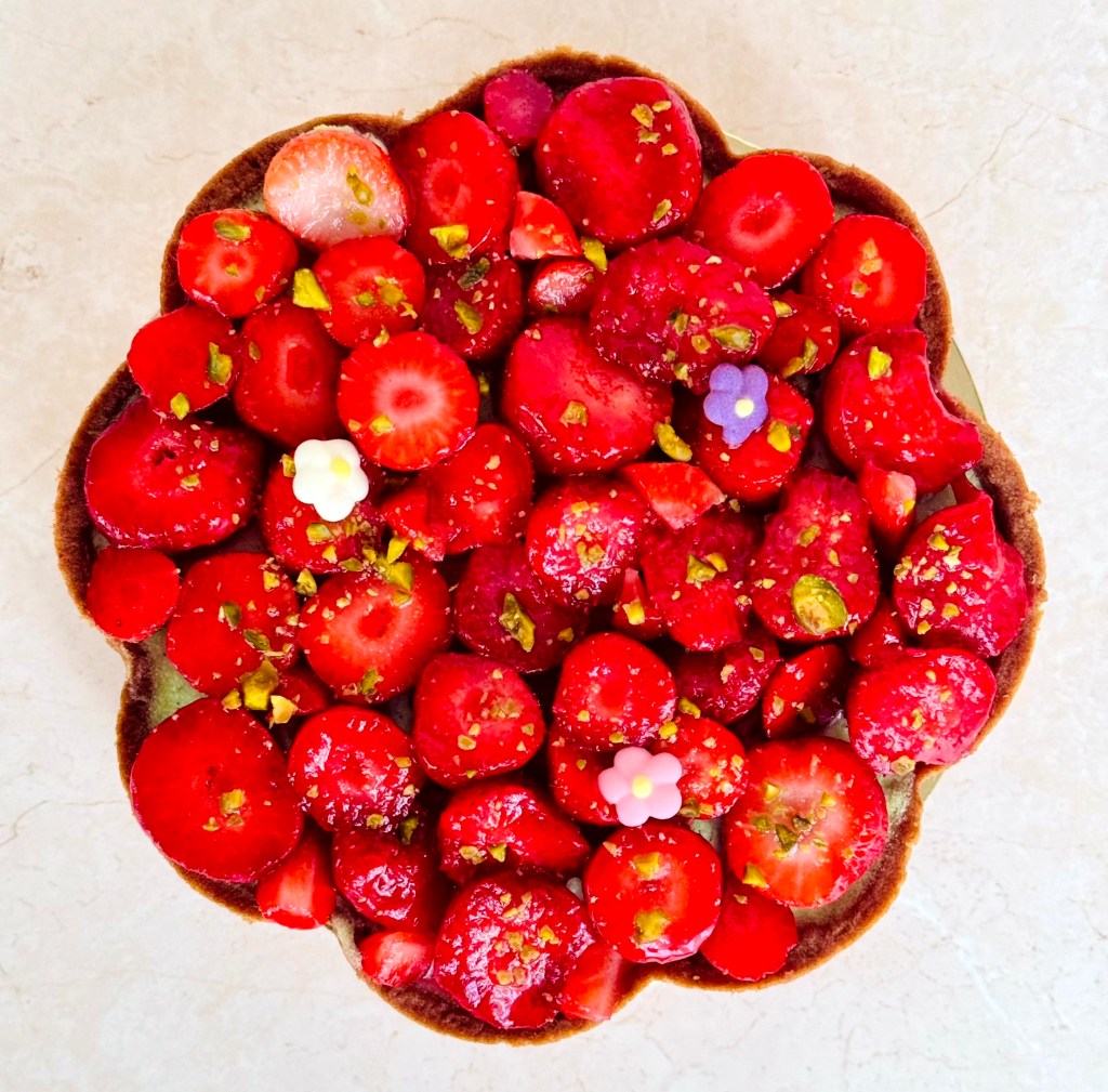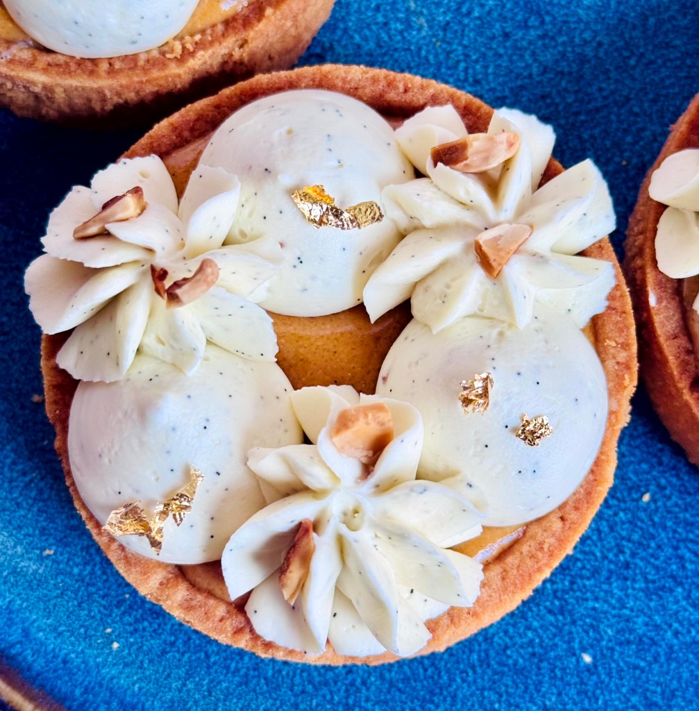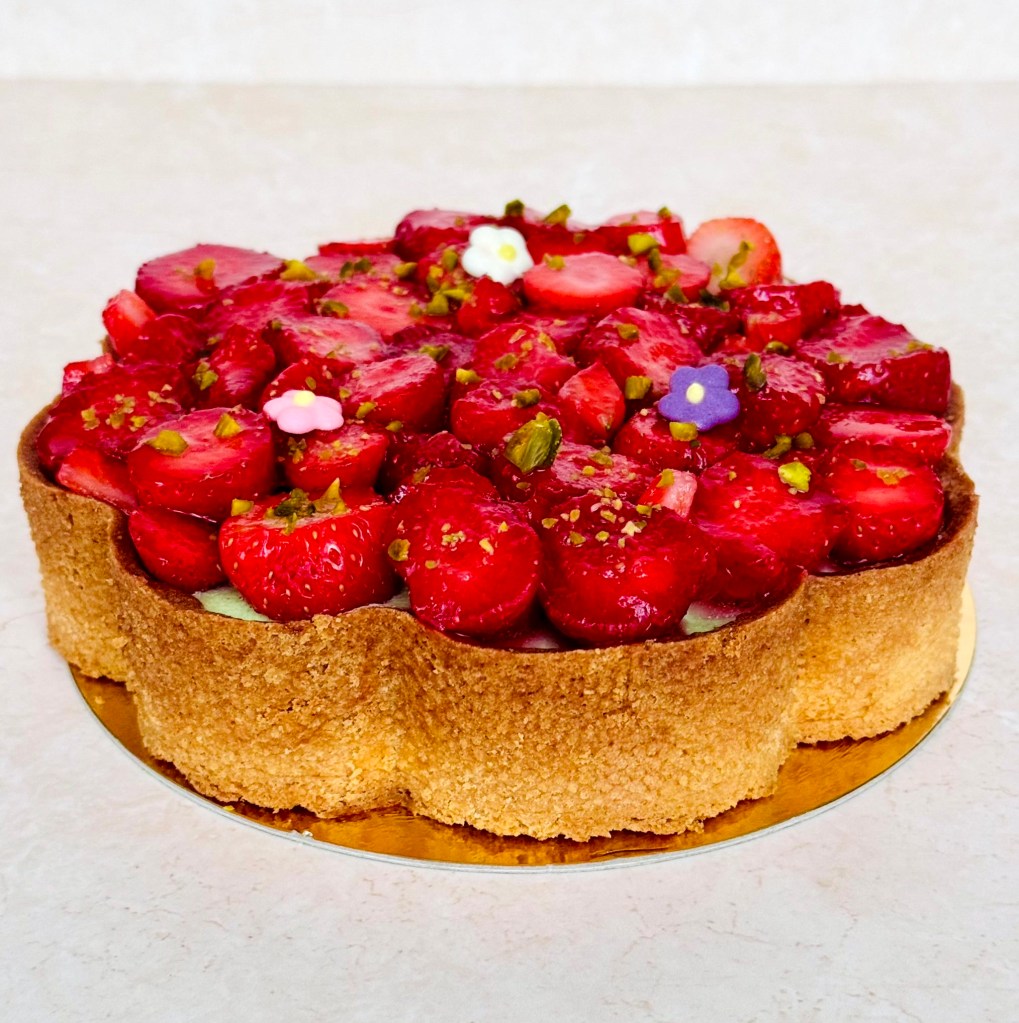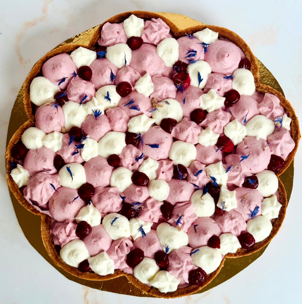 Tarif : 50€ — Une tarte réalisée sur deux jours, avec un vrai travail des températures et une décoration soignée, pensée comme un petit travail d’orfèvre