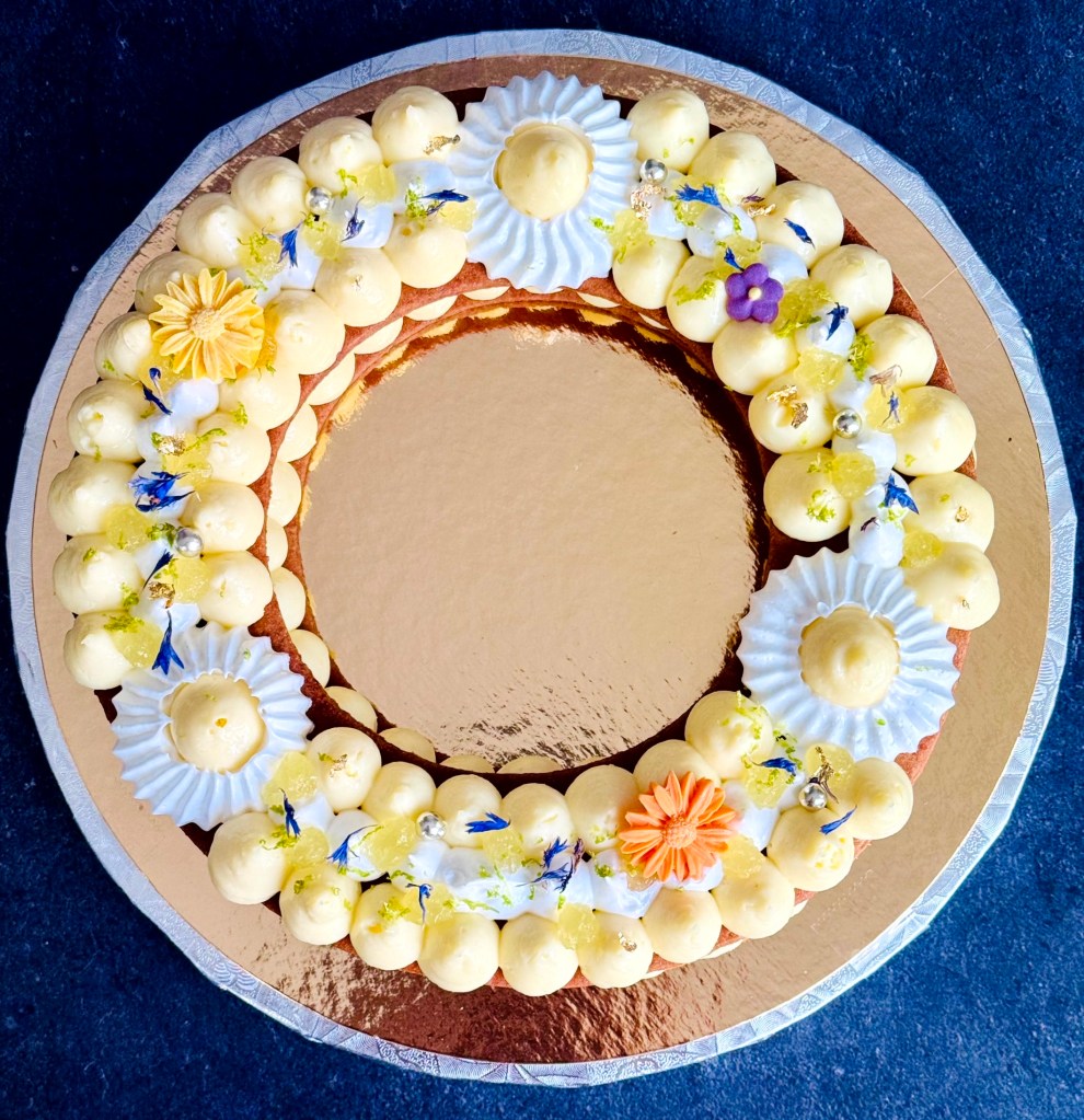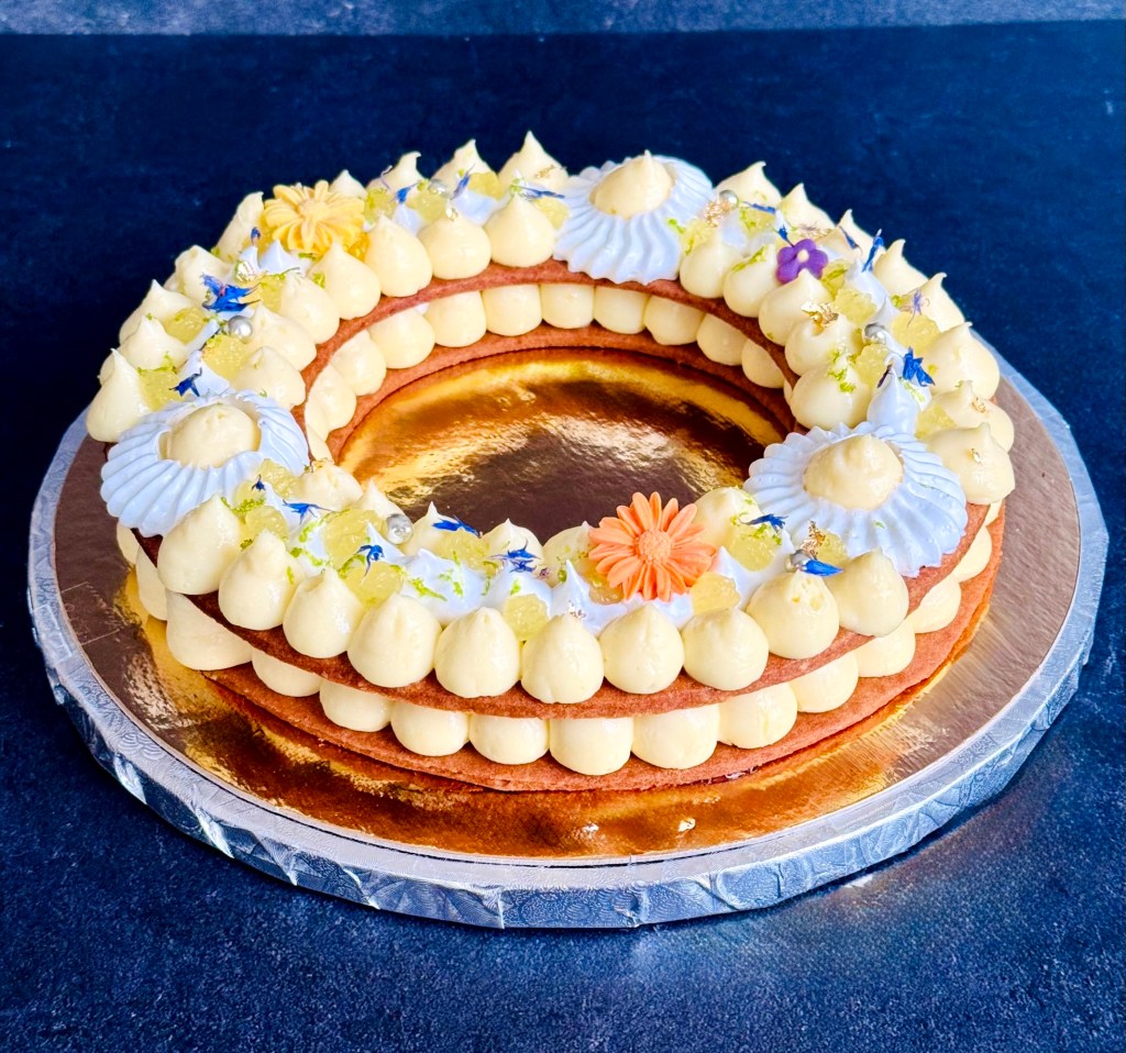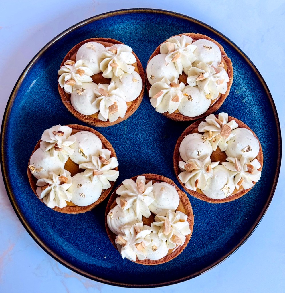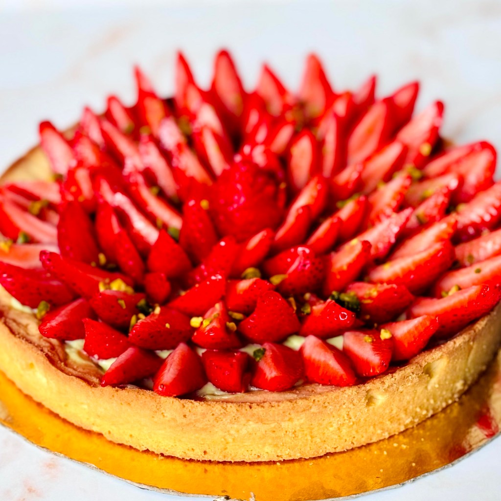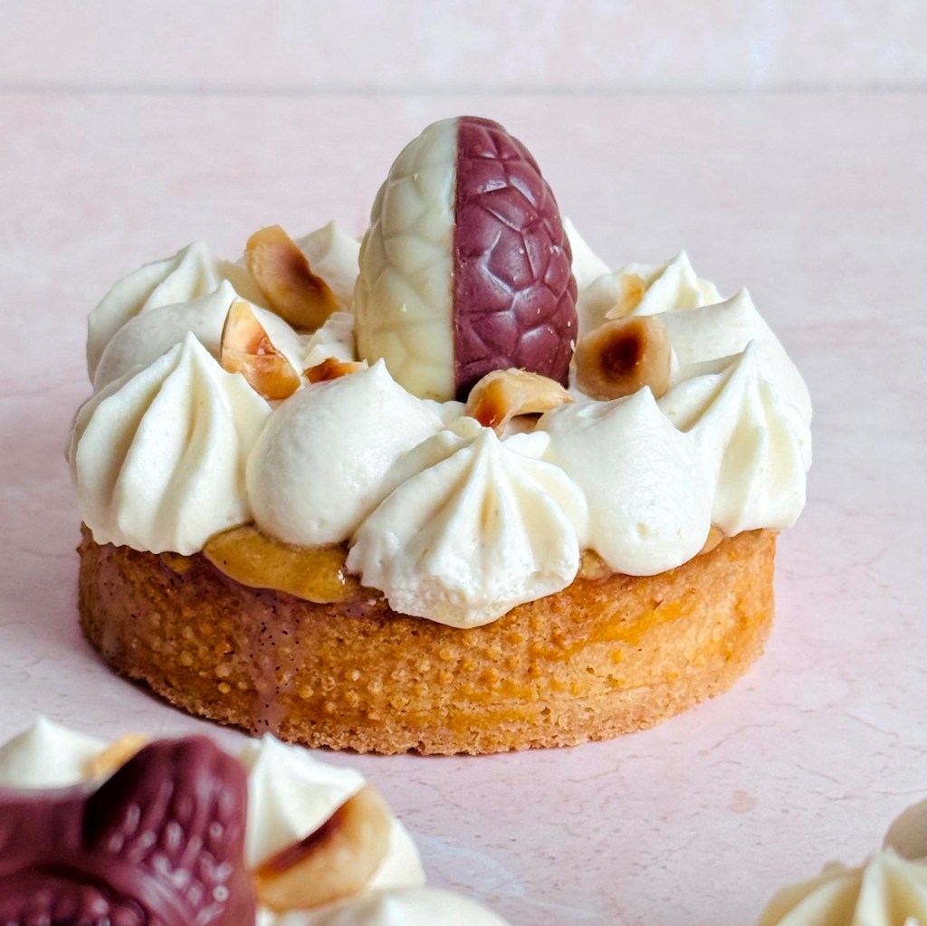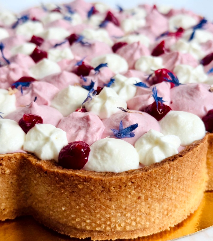 Tarif : 50€ — Une tarte réalisée sur deux jours, avec un vrai travail des températures et une décoration soignée, pensée comme un petit travail d’orfèvre