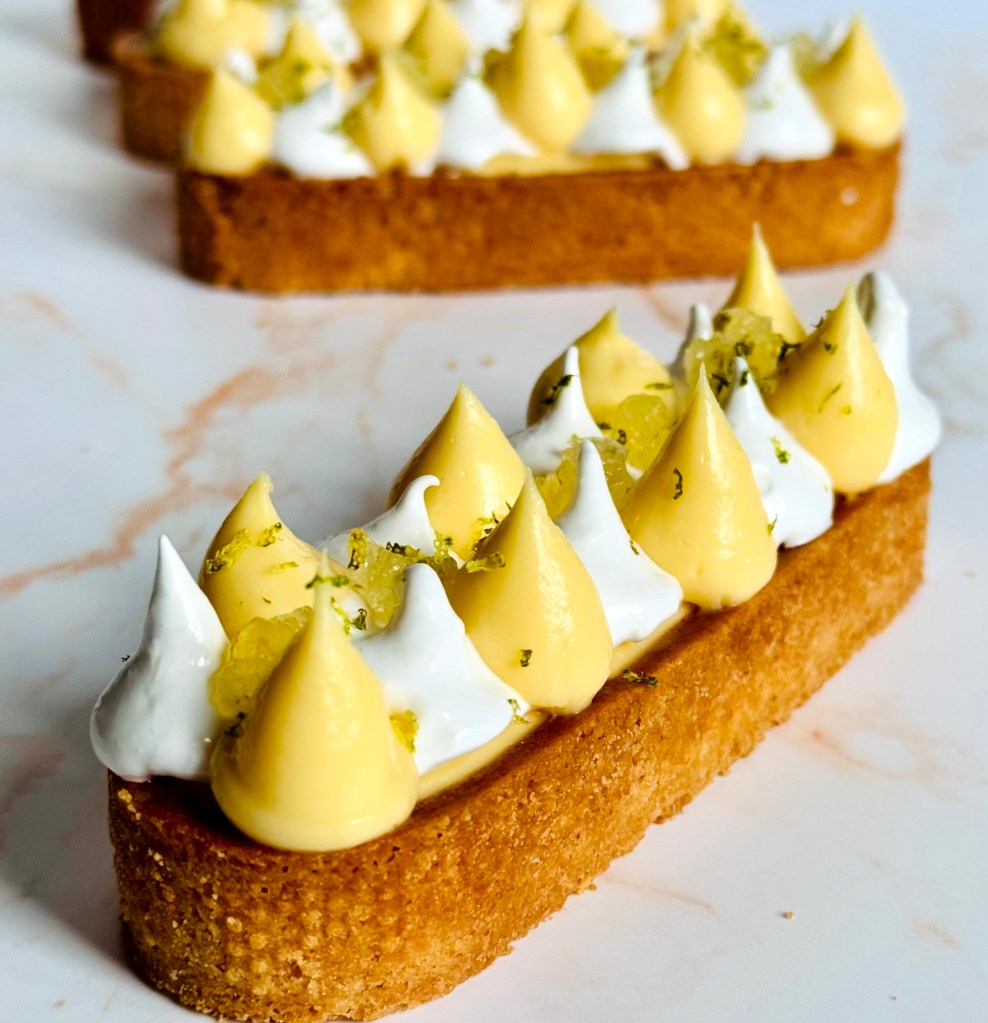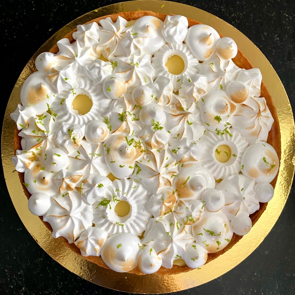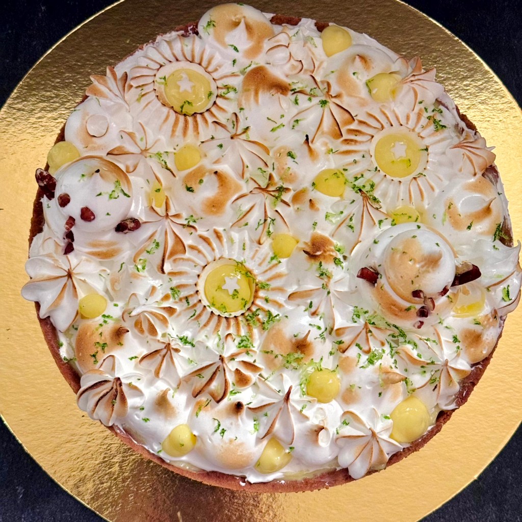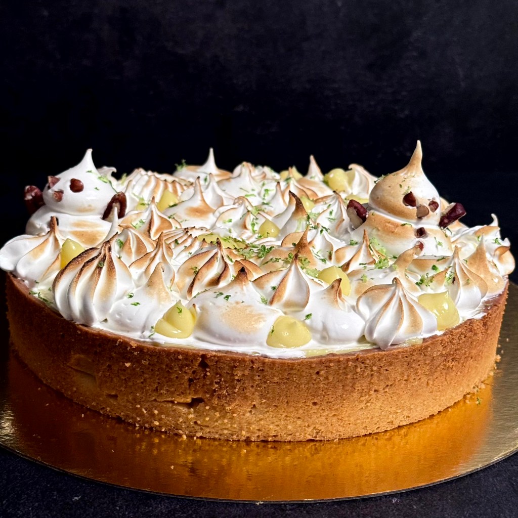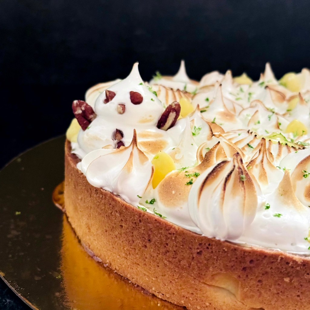 Tarif : 50€ — Une tarte réalisée sur deux jours, avec des préparations travaillées en deux temps, une meringue pochée avec soin. Un équilibre fin entre technique, précision… et peps.