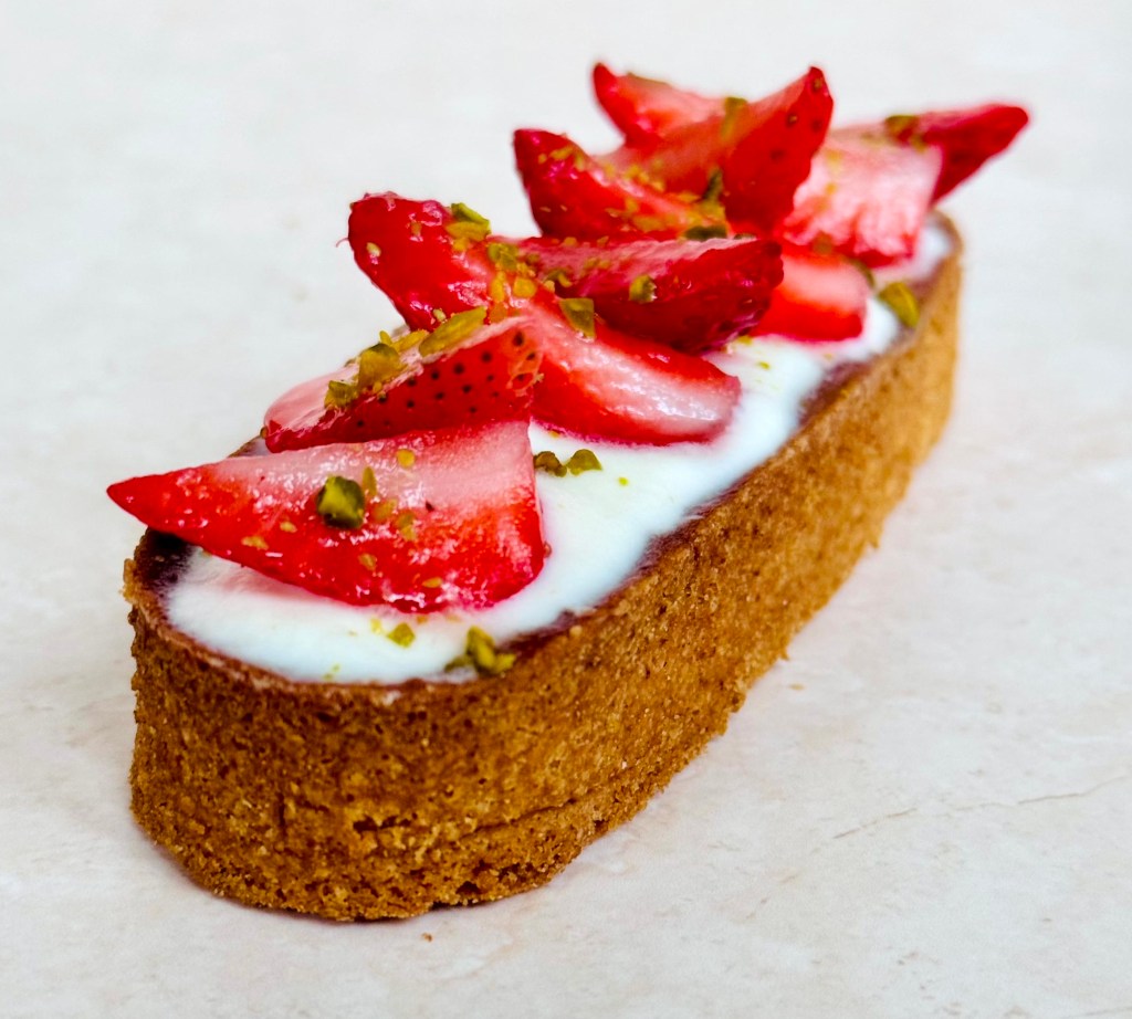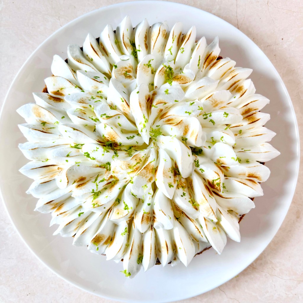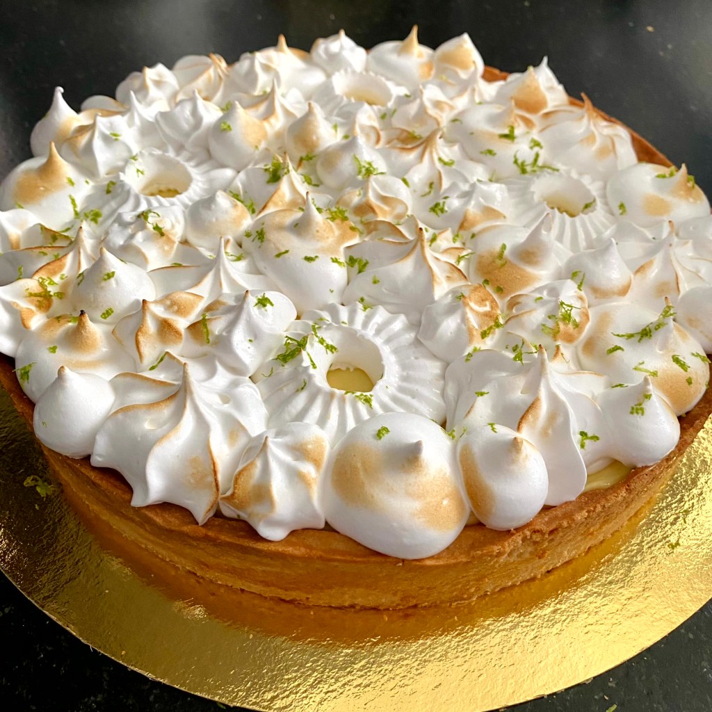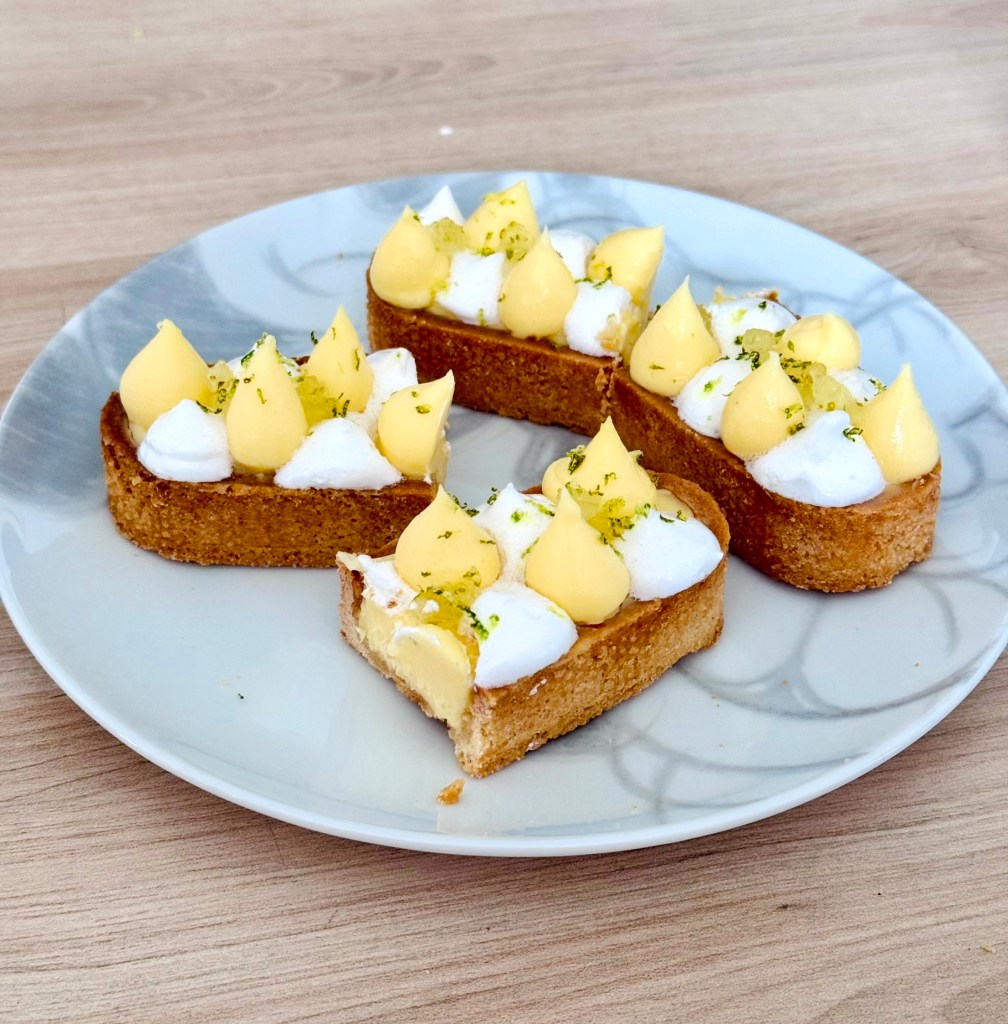 Tarif : 50€ — Une tarte réalisée sur deux jours, avec des préparations travaillées en deux temps, une meringue pochée avec soin. Un équilibre fin entre technique, précision… et peps.