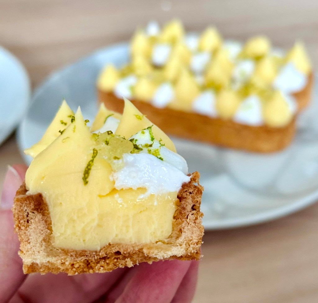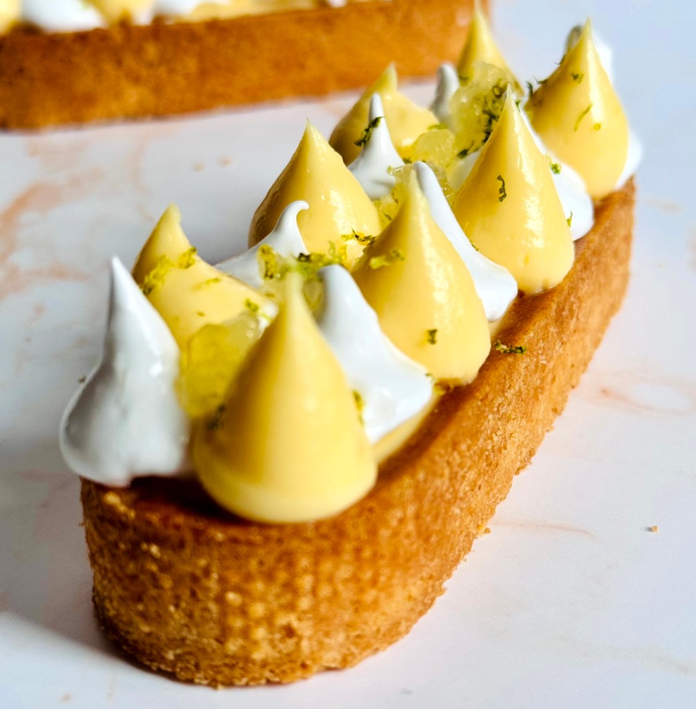 Sous la meringue italienne moelleuse et légèrement dorée, se cache un curd au citron tout en douceur, et un confit de citron vert qui apporte la touche acidulée finale. Le tout reposant sur une pâte croquante.